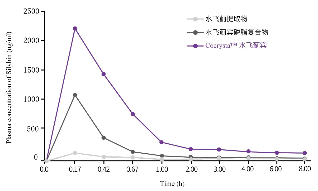 研究團隊以雄性大(dà)鼠為(wèi)實驗對(duì)象開(kāi)展藥代動力學實驗,對(duì)比普通(tōng)水(shuǐ)飛(fēi)薊賓提取物(wù)、水 (shuǐ)飛(fēi)薊賓共晶和(hé)水(shuǐ)飛(fēi)薊賓磷脂複合物(wù)的(de)吸收特性。鑒于水(shuǐ)飛(fēi)薊賓共晶在水(shuǐ)基介質中易解離(lí)的(de)特性,選用(yòng)大(dà)豆油作(zuò)為(wèi)遞送介質以确保穩定性。實驗将18隻體(tǐ)重220 ×- 250g的(de)雄性大(dà)鼠随機(jī)分(fēn)為(wèi)三組,每組6隻。實驗前大(dà)鼠禁食過夜、自(zì)由飲水(shuǐ¥),實驗時(shí)每組通(tōng)過灌胃給予50mg/kg(以水(shuǐ)飛(fēi)薊賓計(jì))受試物(wù),給藥4小(xiǎo)時(shí)後恢複喂食。在給藥後的(de)10∏分(fēn)鐘(zhōng)、25分(fēn)鐘(zhōng)、40分(fēn)鐘(zhōng)、1小(xiǎo)時(÷shí)、2小(xiǎo)時(shí)、3小(xiǎo)時(shí)、4小(xiǎo)時(shí)、6小(xiǎo)時(shí)和(hé)8小(xiǎo✔)時(shí),從(cóng)大(dà)鼠眶窦采集約400µL血液樣本置于肝素化(huà)試管。通(tōng)過分(fēn)析血液樣本繪制(zhì)血漿濃度 - 時(shí)間(jiān)曲"線并計(jì)算(suàn)藥代動力學參數(shù)。結果表明(míng),相(xiàng)同劑量下(xià),水(shuǐ)飛(fēi)薊賓共晶的(de)最大(dà)血藥濃度(Cmax)和(hé)藥時(shí)曲線下(xià)面積(AUC0-8h)分(fēn)别是(shì)普通(tōng)水(shuǐ)飛(fēi)薊提取物(wù)的(de)16.4倍和(hé)16.2倍,而水(shuǐ)飛(fēi)薊賓磷脂合物(®wù)僅為(wèi)普通(tōng)水(shuǐ)飛(fēi)薊提取物(wù)的(de)8.1倍和(hé)6.4倍。這(zhè)充分"(fēn)說(shuō)明(míng),水(shuǐ)飛(fēi)薊賓共晶生(shēng)物(wù)利用(yòng)度大(dà)幅提升,能(néng)更有(yǒu)效地(d•ì)被機(jī)體(tǐ)吸收進入血液循環系統,發揮肝髒保護作(zuò)用(yòng)[1]。
