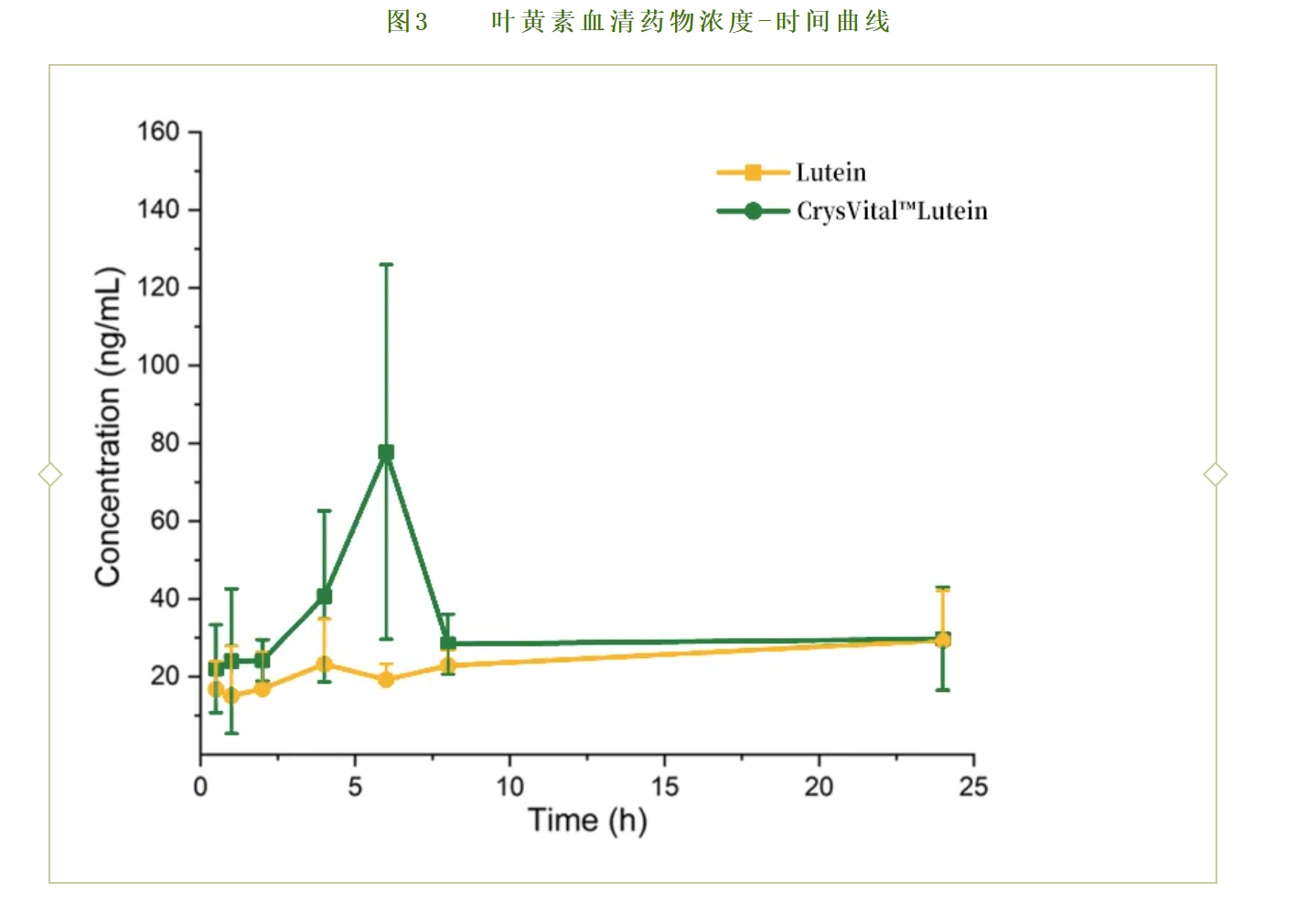 共晶科(kē)技(jì)應用(yòng)藥物(wù)共晶技(jì)術(shù)獲得(de)的(de)專利産品葉黃(huáng)素共晶:Cry÷sVital TM Lutein,穩定性增強(如(rú)圖1),溶解度提高(gāo)(如(rú)圖2),生(shēng)物(wù)利用(yòng)度增加(如(rú)圖3)。與市(§shì)售葉黃(huáng)素産品相(xiàng)比,CrysVital TM Lutein 在體(tǐ)內(nèi)的(de)最大(dà)血漿濃度提升了(le)約4倍(表1所示)[14]。CrysVital TM Lutein,拓寬了(le)葉黃(huáng)素産品的(de)應用(yòng)途徑。