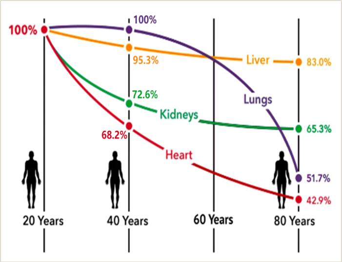 圖1:輔酶Q10随著(zhe)年(nián)齡增長(cháng)在人(rén)體(tǐ)內(nèi)的(de)變化(huà)