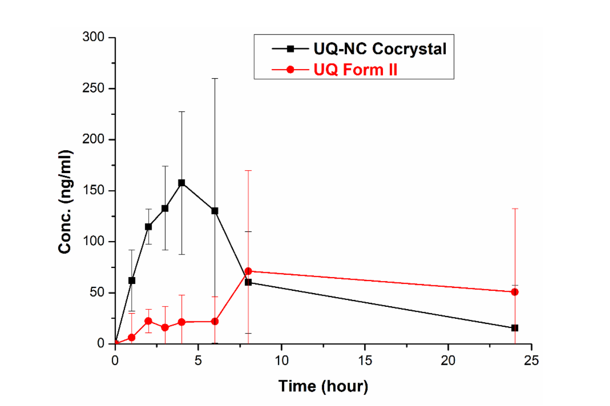 該文(wén)章(zhāng)中主要(yào)介紹了(le)整個(gè)團隊采用(yòng)共晶技(jì)術(shù),合成一(yī)種新的(de)還(hái)原型輔酶Q10和(hé)維生(shēng)素B3 煙(yān)酰胺共晶體(tǐ)(UQ-NC)。并将該共晶産品與市(shì)面上(shàng)銷售的(de)産品進行(xíng)對(duì)比。相(xiàng)比之下(xià),共晶還(hái)原型輔酶Q10具有(yǒu)出色的(de)穩定性、更好(hǎo)的(de)溶解性能(néng)和(hé)更高(gāo)的(de)生(shēng)物(wù)利用(yòng)度。在加速條件(jiàn)下(xià)儲存6個(gè)月(yuè),共晶還(hái)原型輔酶Q10的(de)含量基本不(bù)變。溶解度實驗表明(míng): 在模拟胃液中,共晶的(de)最大(dà)溶出濃度是(shì)市(shì)售原料的(de) 12.6 倍,在模拟腸液中是(shì)市(shì)售産品的(de) 38.3 倍。同時(shí),通(tōng)過比較共晶還(hái)原型輔酶Q10和(hé)市(shì)售輔酶QH在大(dà)鼠體(tǐ)內(nèi)的(de)生(shēng)物(wù)利用(yòng)度。結果表明(míng),共晶的(de)最大(dà)血藥濃度是(shì)市(shì)售産品的(de)2.2倍,AUC是(shì)市(shì)售産品的(de)4.5倍。