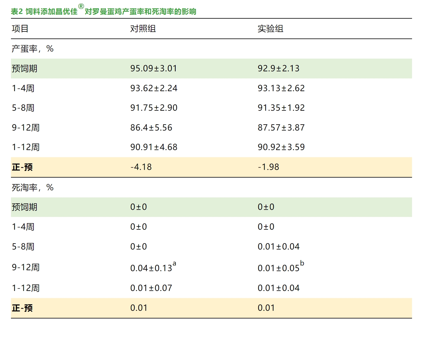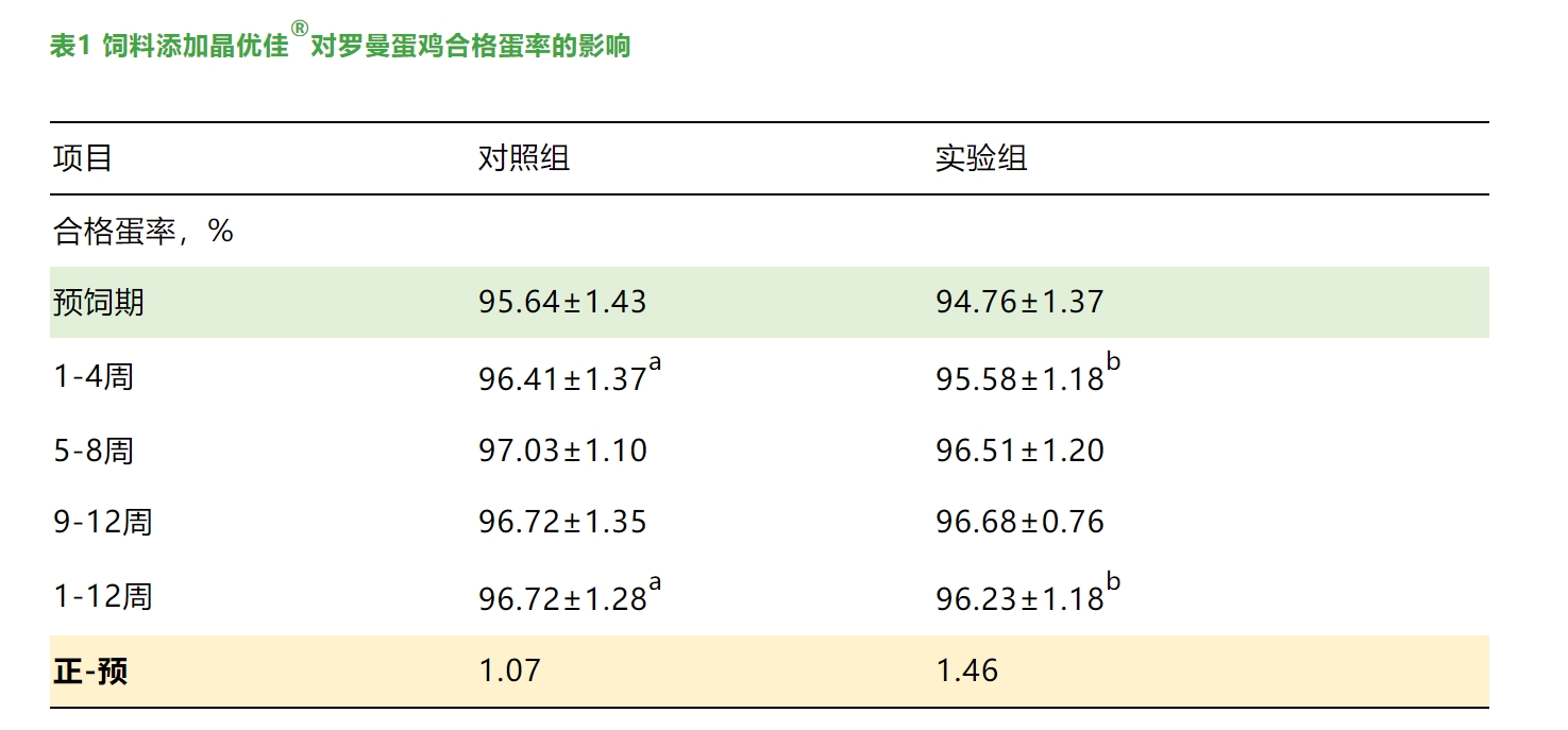 在研究晶優佳®對(duì)900隻200日(rì)齡羅曼蛋雞生(shēng)産性能(néng)的(de)影(yǐng)響時(shí)發現(xiàn),晶優佳®能(néng)夠改善羅曼蛋雞的(de)合格蛋率(如(rú)表1所示),提高(gāo)産蛋率,但(dàn)對(duì)死淘率無影(yǐng)響↑(如(rú)表2所示)。