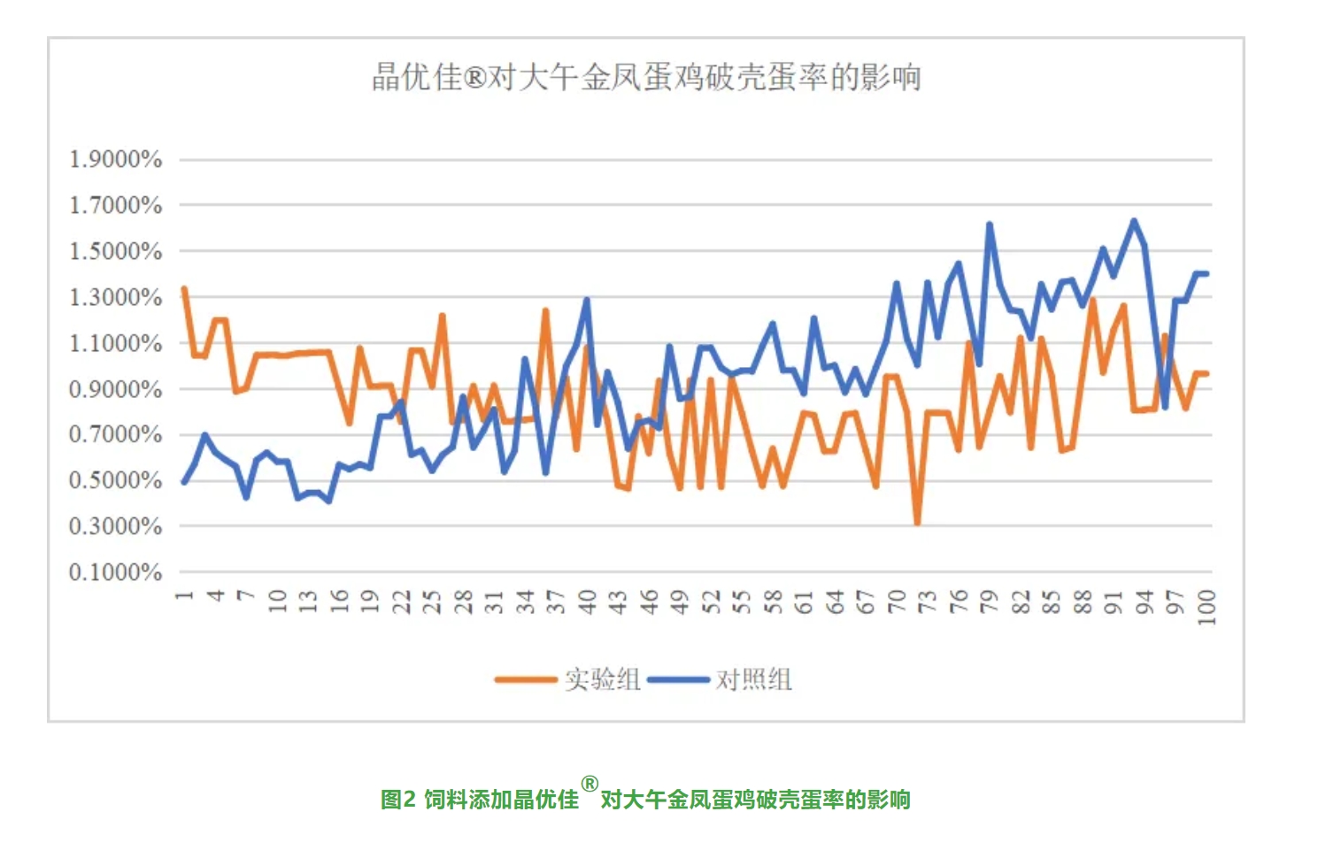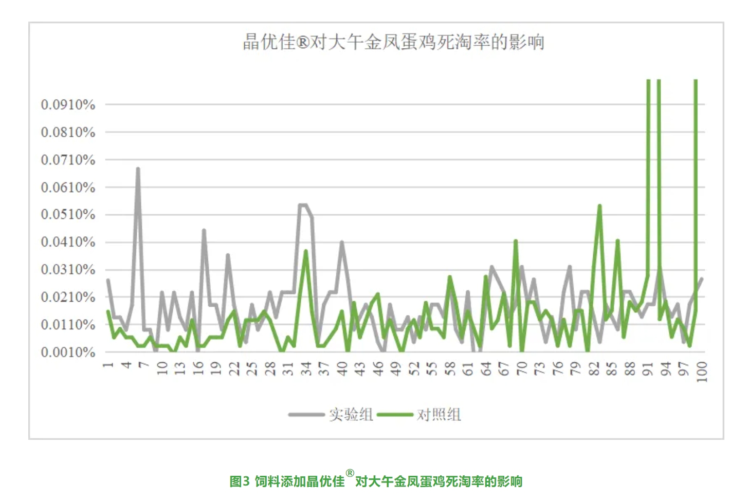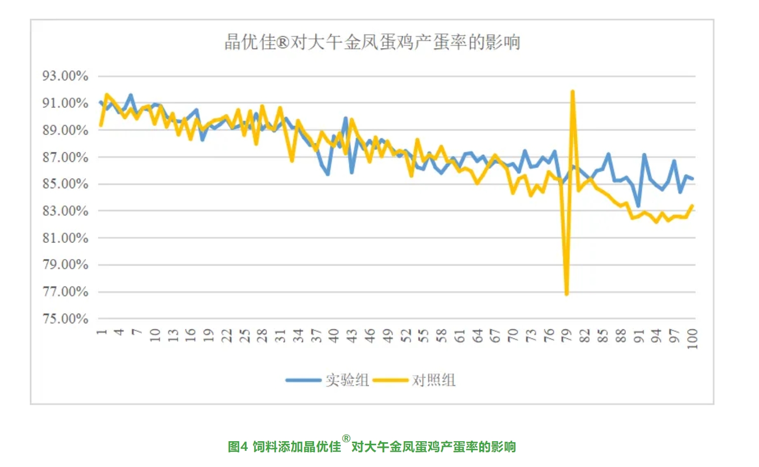 另一(yī)項研究發現(xiàn),飼料添加晶優佳®能(néng)夠改善大(dà)午金(jīn)鳳蛋雞(>40000隻300日(rì)齡)破殼蛋率(如(rú)圖2所示)λ和(hé)死淘率(如(rú)圖3所示),并延緩産蛋率的(de)下(xià)降(如(rú)圖4所示)。