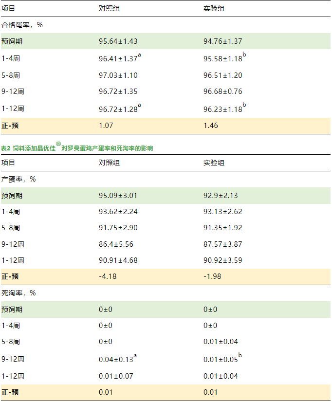 表1 飼料添加晶優佳®對(duì)羅曼蛋雞合格蛋率的(de)影(yǐng)響