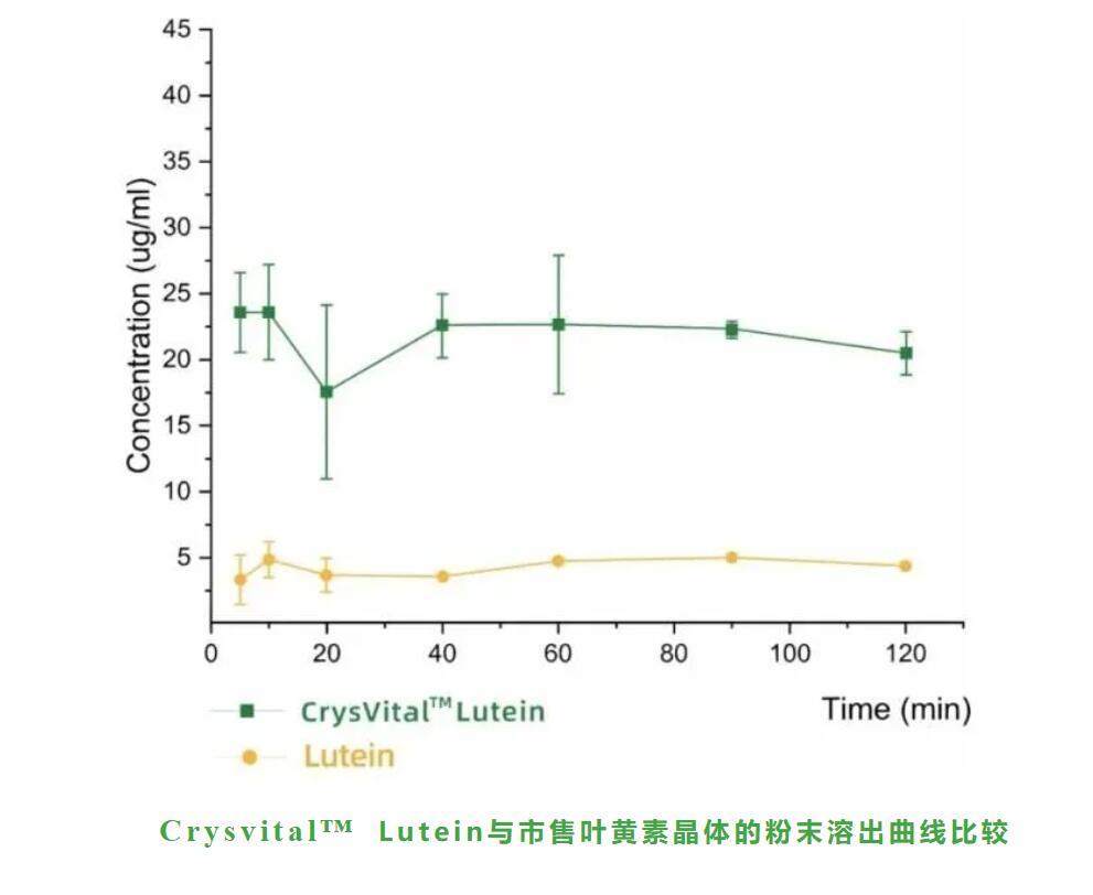 2024年(nián)高(gāo)影(yǐng)響因子(zǐ)期刊的(de)最新研究顯示[13]:在37℃,模拟胃液的(de)條件(jiàn)下(xià),與市(shì)售葉黃(huáng)素晶體(tǐ)(Lutein)相(xiàng)比,Crysvital™ 葉黃(huáng)素溶解度提高(gāo)5倍。