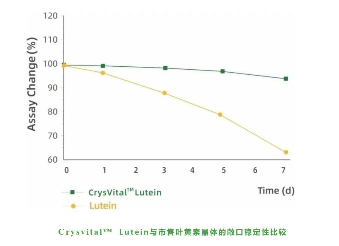 (a) 在25℃,相(xiàng)對(duì)濕度60%,敞口,無包裝或氮氣保護條件(jiàn)下(xià)放(fàng)置7天,Crysvital™ 葉黃(huáng)素隻有(yǒu)2%左右被氧化(huà),而市(shì)售葉黃(huáng)素晶體(tǐ)(Lutein)則降解38%。