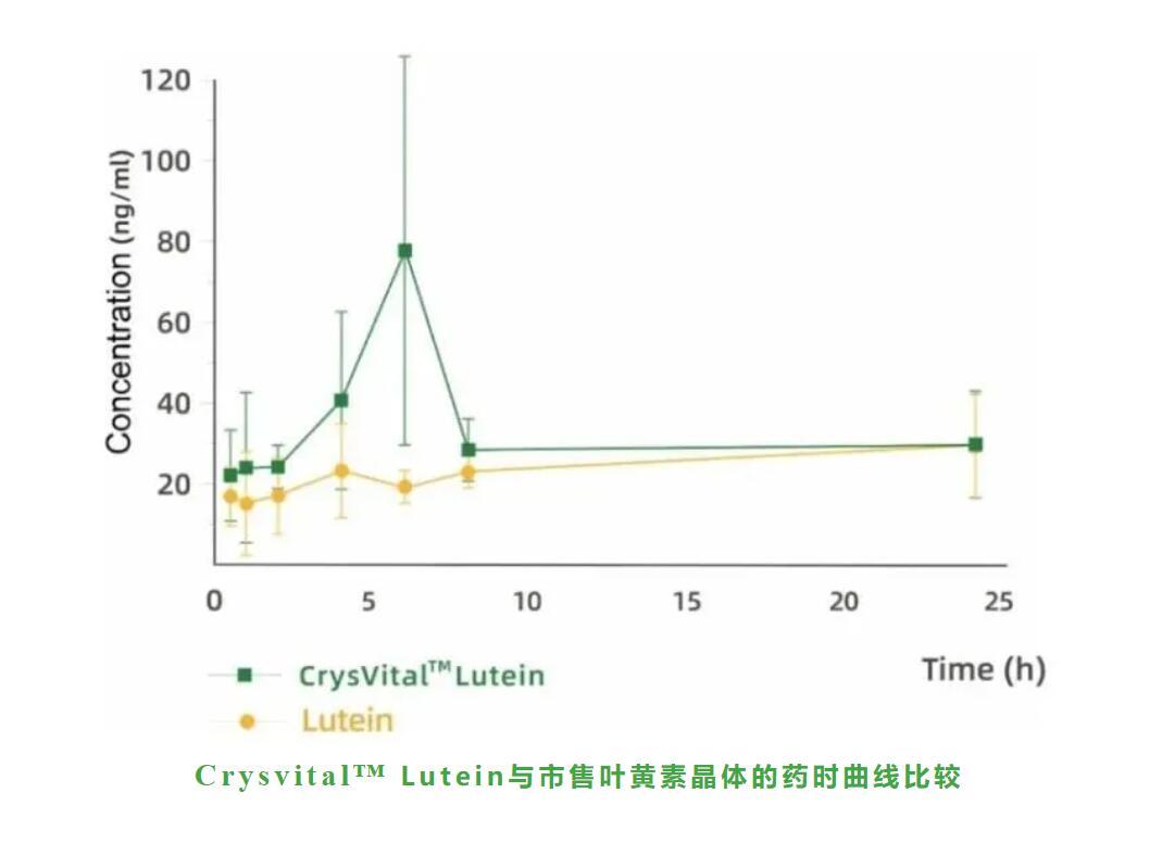整體(tǐ)來(lái)看(kàn),Crysvital™葉黃(huáng)素提高(gāo)了(le)穩定性;同時(shí),相(xiàng)關可(kě)食用(yòng)輔料配體(tǐ)的(de)引入還(hái≤)增強了(le)葉黃(huáng)素共晶的(de)親水(shuǐ)性,提高(gāo)了(le)葉黃(huáng)素共晶的(de)溶解度,進而提升了(le)葉黃(huáng)素的(de)吸收(生(shēng)物(wù)利用(yòng)度)。