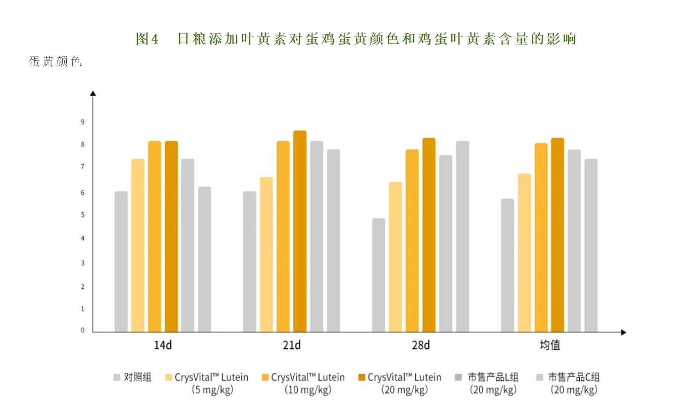 日(rì)糧添加1/2劑量葉黃(huáng)素(CrysVital TM Lutein 産品10 ppm),與L組相(xiàng)比,CrysVital TM Lutein(10 mg/kg)組蛋黃(huáng)葉黃(huáng)素含量提高(gāo)2.63 mg/kg(15.31 mg/kg vs☆ 12.68 mg/kg);與C組相(xiàng)比,CrysVital TM Lutein(10 mg/kg)組蛋黃(huáng)內(nèi)葉黃(huáng)素含量提高(gāo)1.31 mg/kg(≥15.31 mg/kg vs 14.00 mg/kg)。