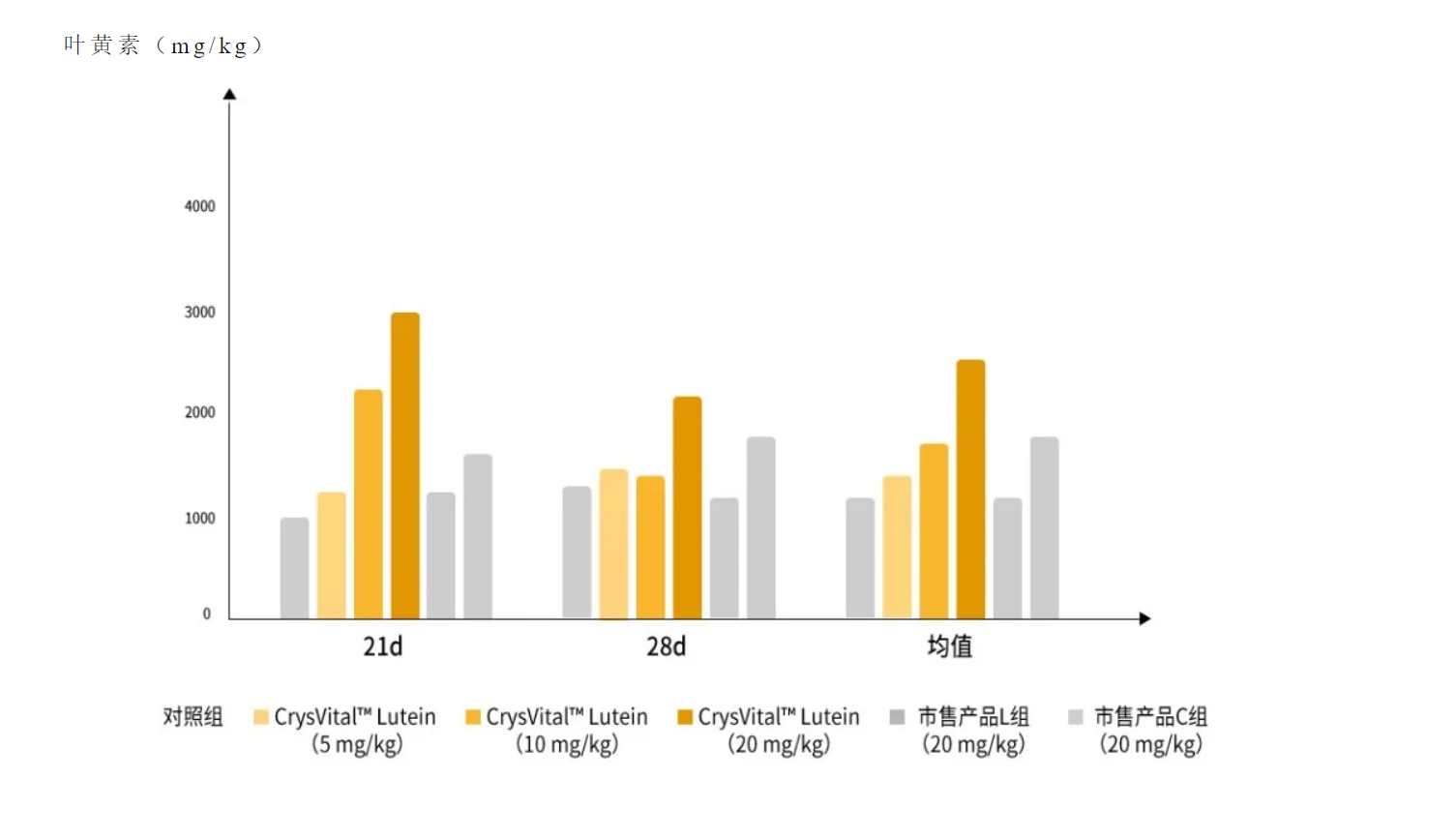 日(rì)糧添加同劑量葉黃(huáng)素,與L組相(xiàng)比,CrysVital TM Lutein(20 mg/kg)組蛋黃(huáng)葉黃(huáng)素含量提高(gāo)5.87 mg/kg(18.55 mg/$kg vs 12.68 mg/kg);與C組相(xiàng)比,CrysVital TM Lutein(20 mg/kg)組蛋黃(huáng)葉黃(huáng)素含量提高(gāo)4.55 mg/kg(1♣8.55 mg/kg vs 14.00 mg/kg)。