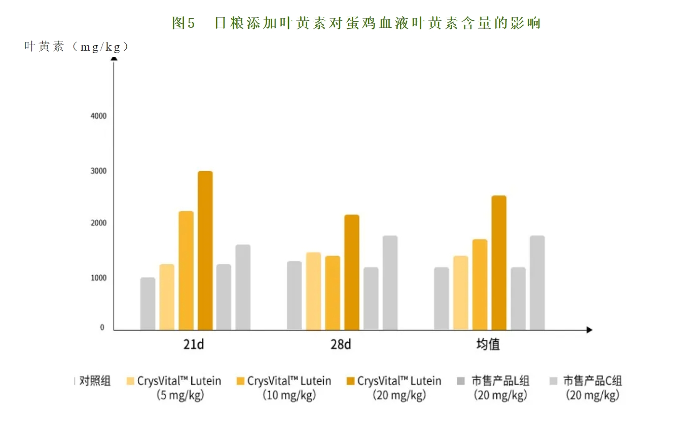 (2)由圖5可(kě)知(zhī),與對(duì)照(zhào)組相(xiàng)比,實驗21d時(shí),CrysVital TM Lutein(10 mg/kg和(hé)20mg/kg)組血液葉黃(huáng)素含量顯著高(gāo)于其他(tā)四組(P < 0.01)。
