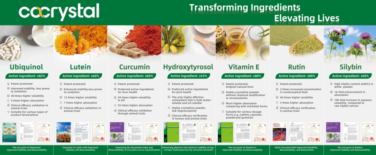 這(zhè)7款産品分(fēn)别為(wèi)Ubiquinol(還(hái)原型輔酶 Q10共晶 )、Lutein(葉黃(✔huáng)素共晶)、Curcumin(姜黃(huáng)素共晶)、Hydroxytyrosol(羟基酪醇共晶)、Vitamin E(維生(shēng)↔素 E共晶)、Rutin(蘆丁共晶)以及 Silybin(水(shuǐ)飛(fēi)薊賓共晶),它們覆蓋多(duō)個(gè)關鍵領域,在營養補充、食品功能(néng)性強化(huà☆)等方面均展現(xiàn)出顯著的(de)優勢與巨大(dà)的(de)應用(yòng)潛力,彰顯了(le)共晶科(kē)技(jì)在食品配料及‍天然原料研發與生(shēng)産領域的(de)深厚專業(yè)功底。