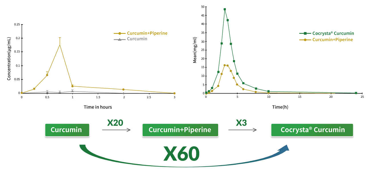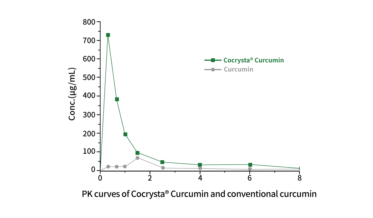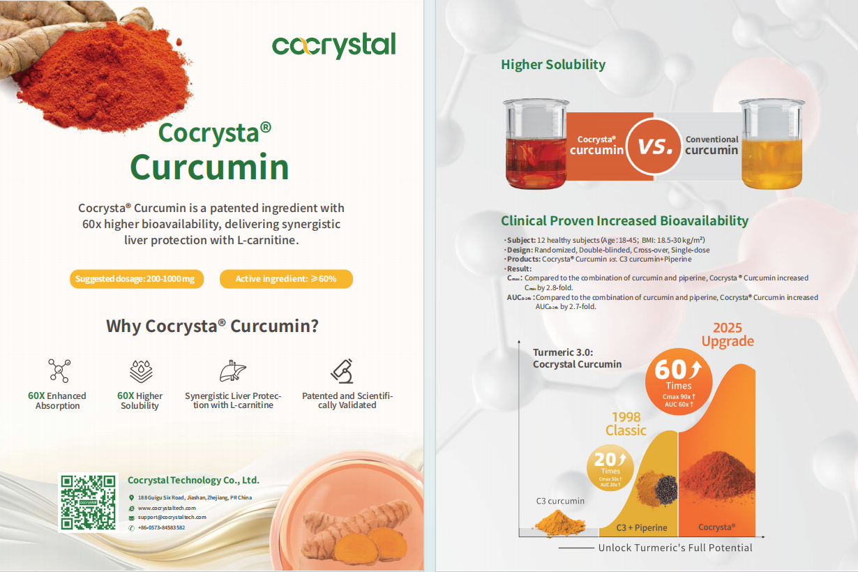 Unlock the full potential of the ingredient with Cocrysta® Curcumin. Powered by cutting-edge cocrystallization technology, our innova←tive formula not only significantly improves solubility but also boasts a remark✔able 60 times higher bioavailability.